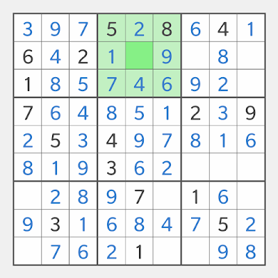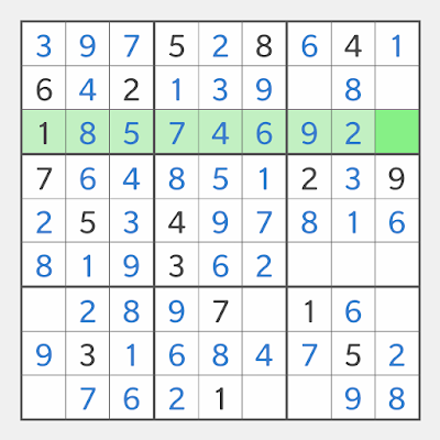 In the Sudoku board below, row 3 is highlighted, and the only empty cell in row 3 is the 9th cell in box 3, so we say 39 is the only empty cell in row 3. Since the only number missing in row 3 is 3, the solution is 393.