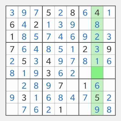 In the Sudoku board below, column 8 is highlighted, and the only empty cell in column 8 is the 8th cell in box 6, so we say 68 is the only empty cell in column 8. Since the only number missing in column 8 is 7, the solution is 687.